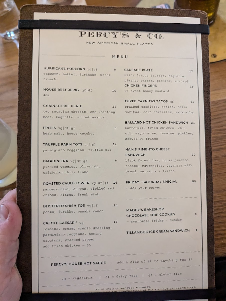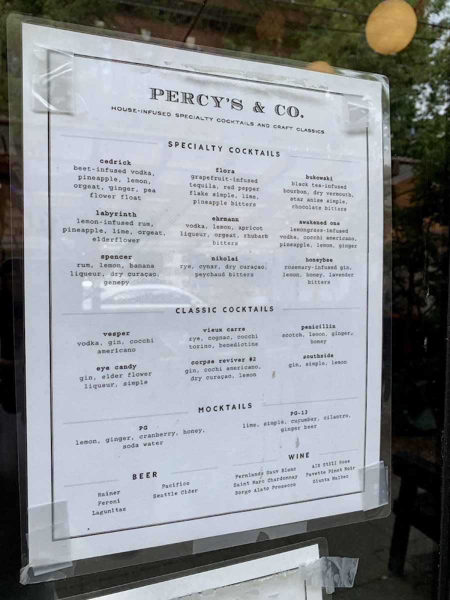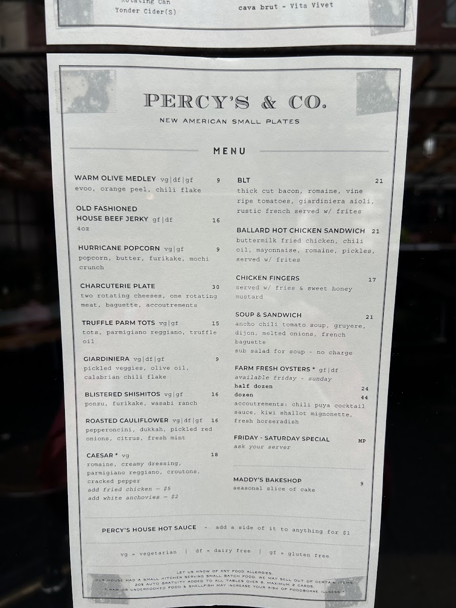 Introducing the menu at Percy's & Co. Seattle, a delightful eatery nestled in the heart of Ballard. Known for its vibrant atmosphere, this spot is perfect for both cozy gatherings and lively celebrations. The menu features a tempting array of dishes, including delectable flatbreads that diners rave about, such as the fainting goat and pea ricotta varieties.